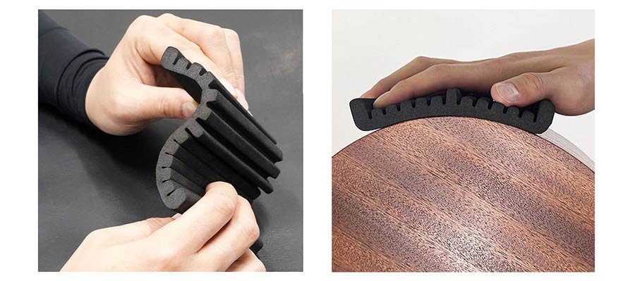 In order to eff ectively polish curved surfaces such as the sides of an acoustic guitar, it is important to make sure that the sanding paper contacts the surface. Until now, you have probably sanded by wrapping the sanding paper around an oval or round block, but with these, the sanding paper actually only touches the guitar surface in a line, which reduces the effi ciency of the sanding process.