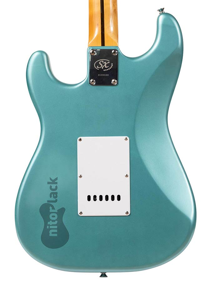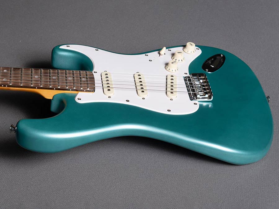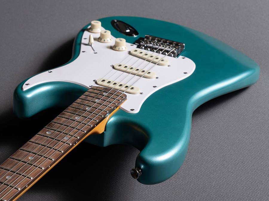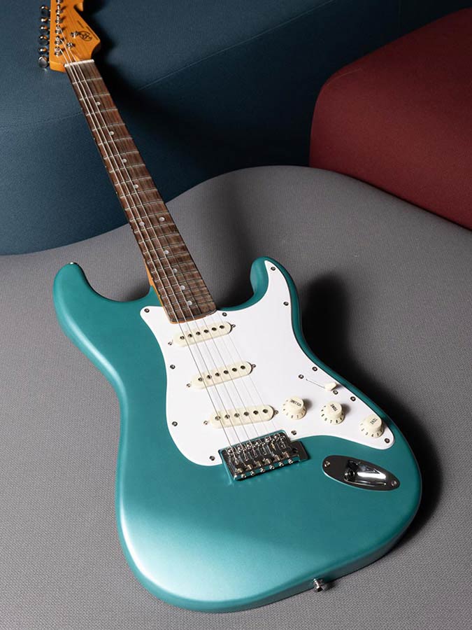 The original name of this colour for cars was Teal. The suffix “Green” was added by Fender when they started using it as a custom colour option. It first appeared in 1962 on Ford/Lincoln cars as Riviera Turquoise Metallic, and on Ford Thunderbirds as Patrician Green. It is widely used on Stratocasters with white pickguards, for both maple and rosewood fingerboards.