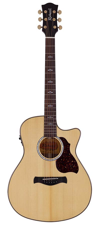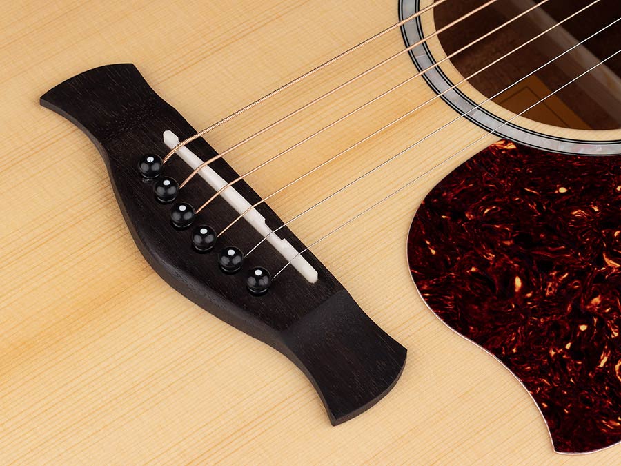 grand auditorium guitar, solid spruce top, cutaway, preamp, flamed maple & abalone, natural gloss