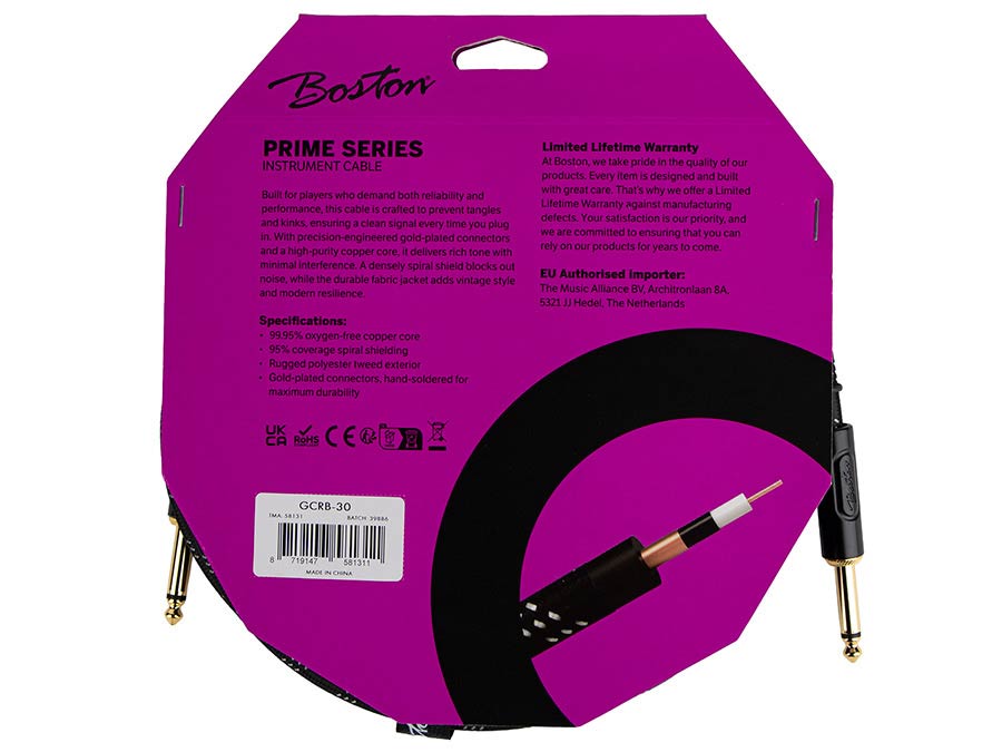 The Boston Prime Series Instrument Cable is designed for players who want dependable performance with a distinctive look. Built around a high-purity oxygen-free copper core, this cable delivers a clear, rich signal with minimal interference, whether on stage or in the studio. The flexible spiral shielding keeps noise under control and is designed to prevent tangles and kinks, while the woven tweed jacket adds durability and a classic vibe. Finished with gold-plated, hand-soldered connectors, the Boston Prime Series Instrument Cable is made to perform reliably, night after night.