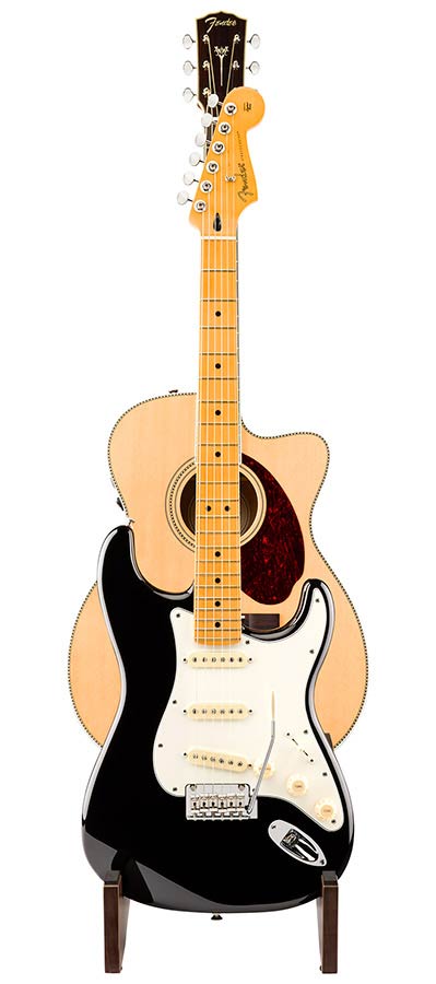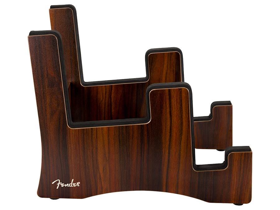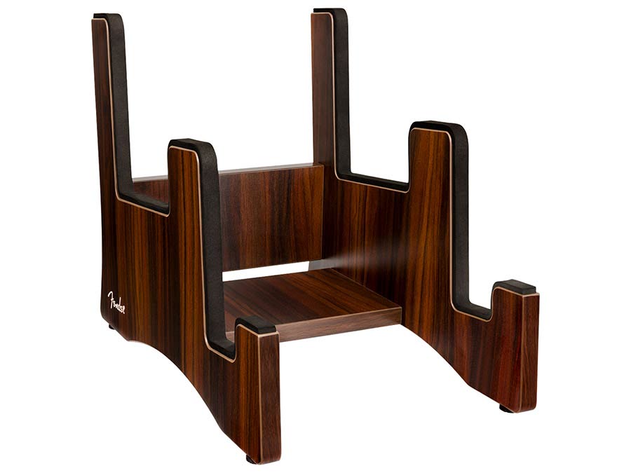 Elevate your music space with the Fender® 2-Tier Wooden Guitar Stand. Designed to hold an acoustic and an electric guitar, it features solid, sturdy construction, soft foam padding, and a rich walnut veneer finish that complements any room. Complete with a laser-etched Fender logo, it’s the perfect blend of form, function, and Fender legacy.