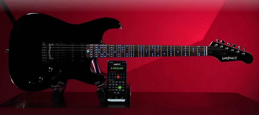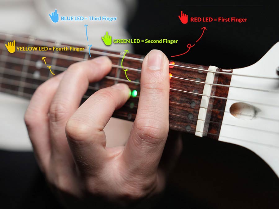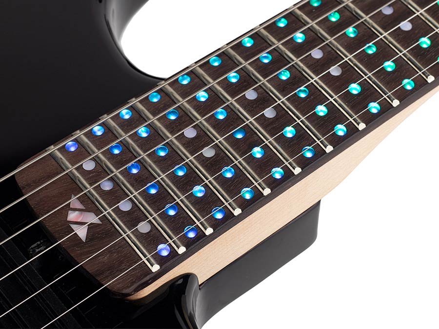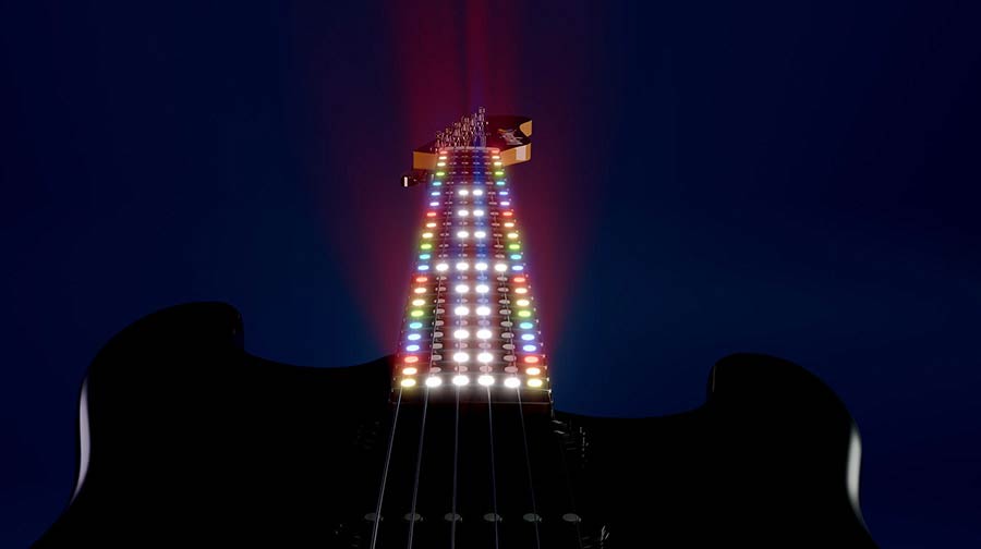 * Full-spectrum RGB LED fretboard showing chords, scales, melodies, and patterns in real time