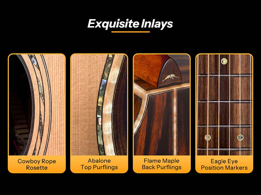 Rocky Mountain Series features an all-solid body with solid red cedar top and solid amara ebony back and sides that advanced players cherish greatly for its full and balanced acoustic tones. The innovative ToneFlow bracing system further increases resonance across the body, creating a wider spectrum of resonances and richer flavors than conventionally braced guitar. A premium mahogany neck is paired with an ebony fingerboard for sleek fretting. Individual setup at factory and meticulous attention to detail ensure a sensational experience.