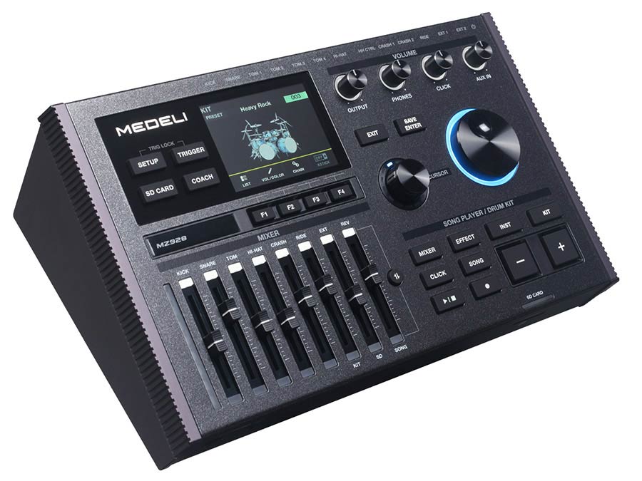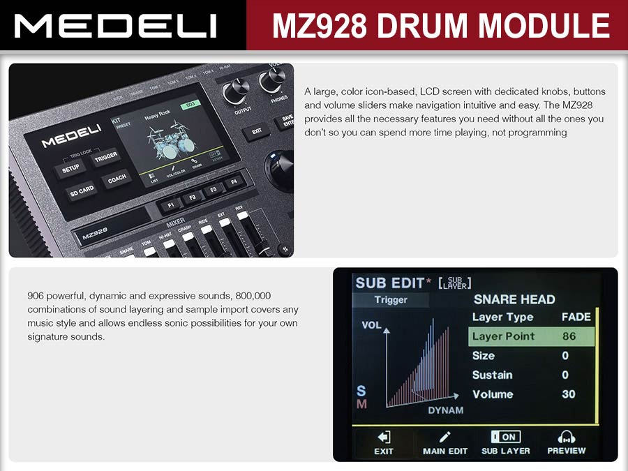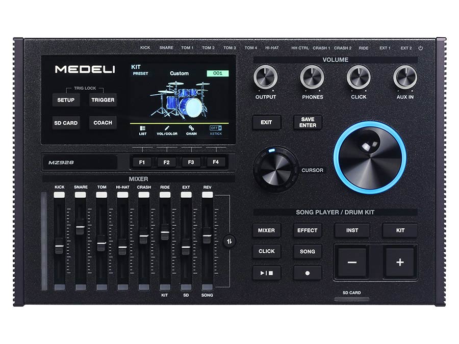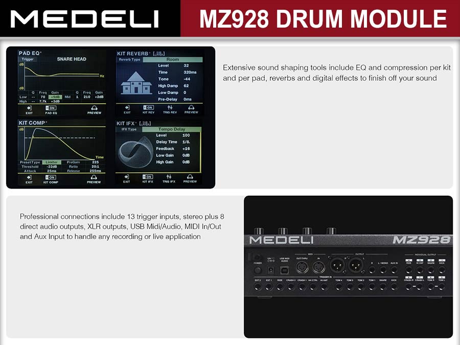 MZ928 drum module, 13 trigger inputs, 8 direct outs, 55 kits, 906 sounds, TFT LCD screen, no PSU
