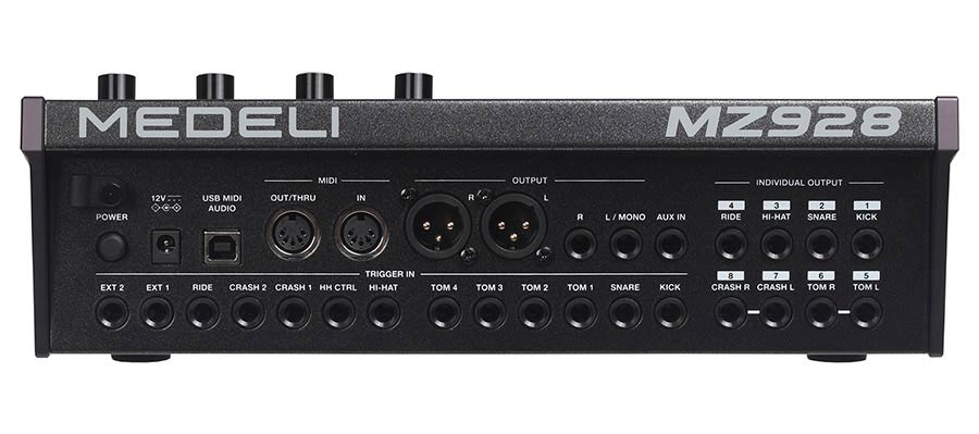 Professional connections include 13 trigger inputs, stereo plus 8 direct audio outputs, XLR outputs, USB Midi/Audio, MIDI In/Out and Aux Input to handle any recording or live application.