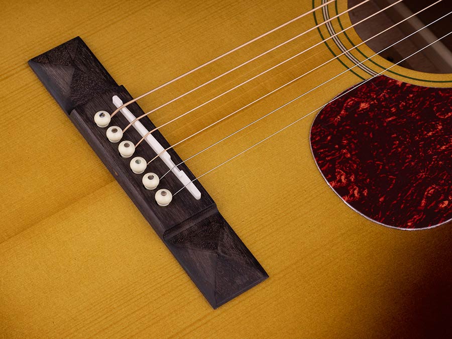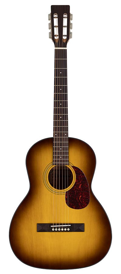 parlor guitar with solid spruce top, edge honeyburst