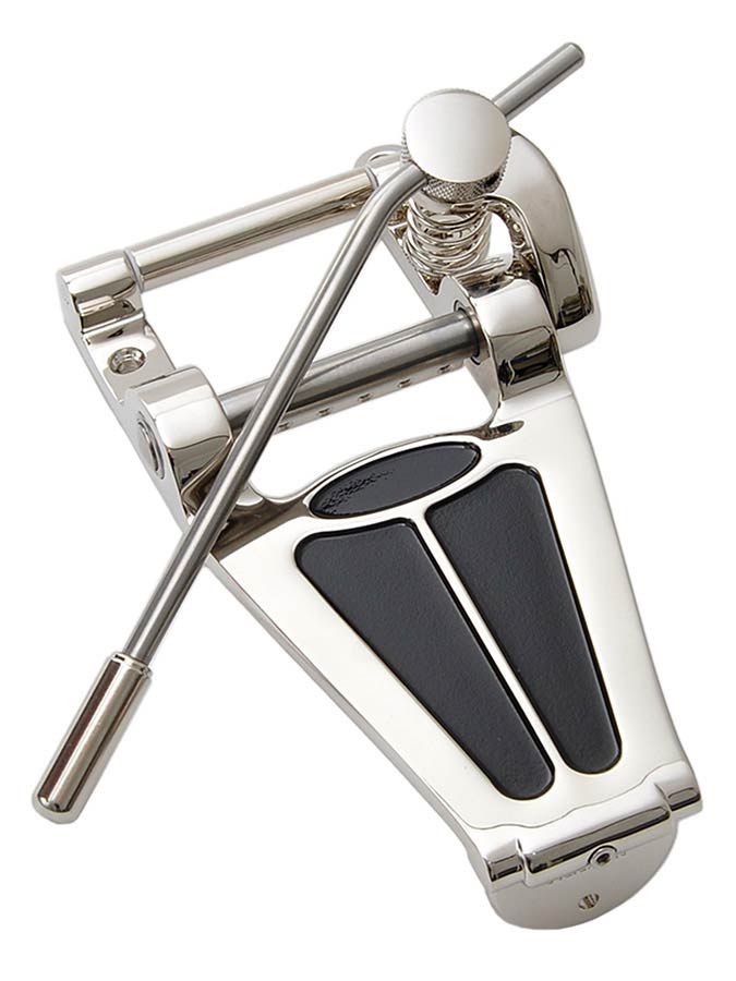 Inspired by the Duesenberg Diamond Deluxe Tremola. Identical in function and material quality! An aluminium frame ensures excellent transmission of the resonances, high-quality bearings allow the well-known smooth tremolo action and ensure optimum tuning stability. The 360° rotatable round arm can be adjusted in length, response, position and movement. Easy string change due to holes in the axis. As easy as stringing a stop tailpiece guitar. Simply the best!